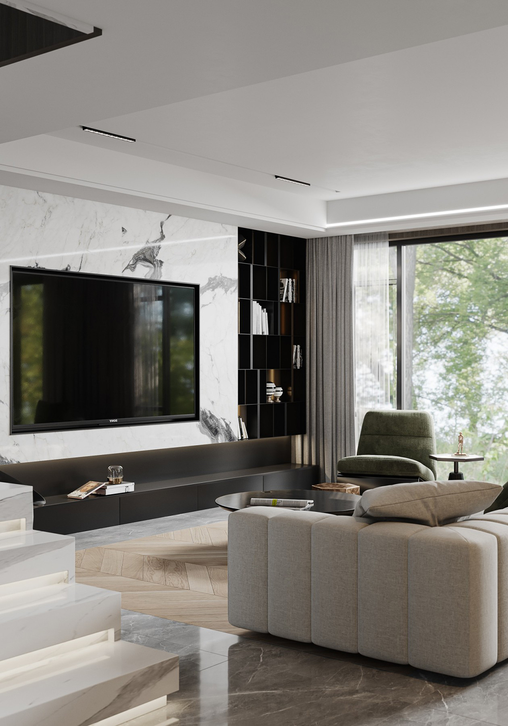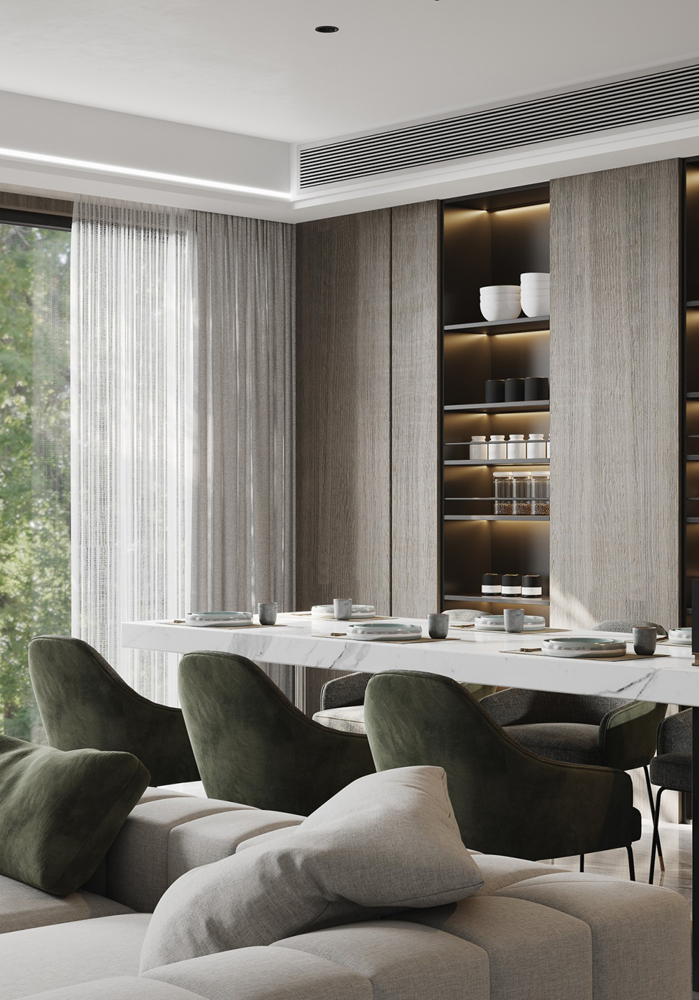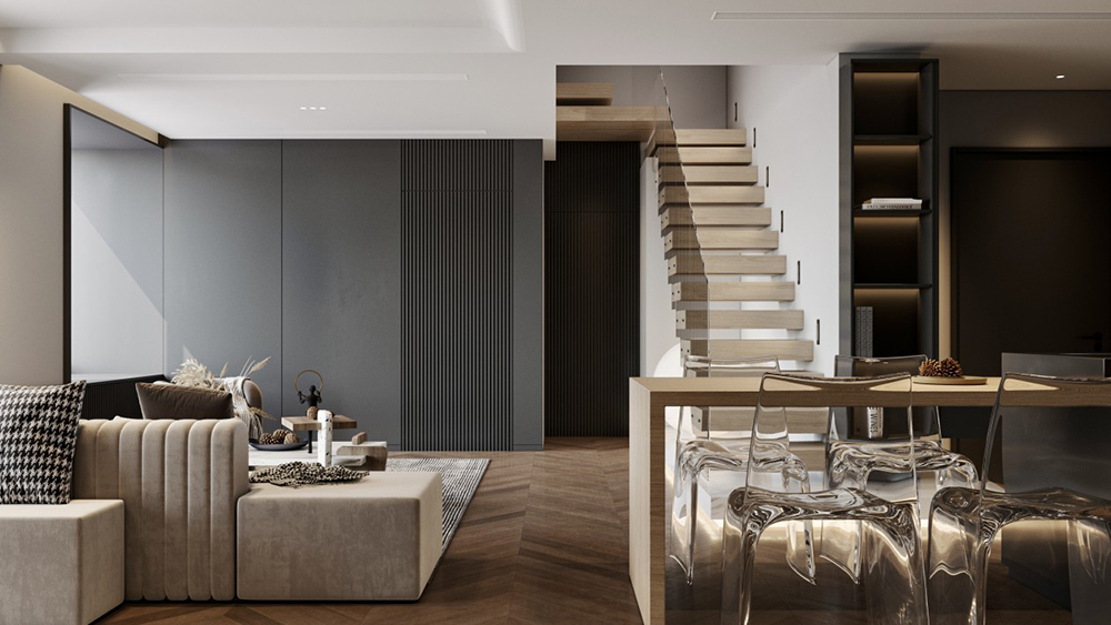 搭配點綴低調(diào)且高貴的綠色調(diào)裝飾豐滿提升空間,但最重要的還是軟裝細(xì)節(jié)處理、空間聯(lián)繫和材料品質(zhì)方面的考究,在合適的位置我們找到空間的統(tǒng)一平衡點,將現(xiàn)代輕奢的其他的元素聯(lián)繫起來, 形成統(tǒng)一格調(diào)的高品質(zhì)空間調(diào)性;簡約中求藝術(shù),化繁為簡,從簡單舒適中體現(xiàn)生活的精致。