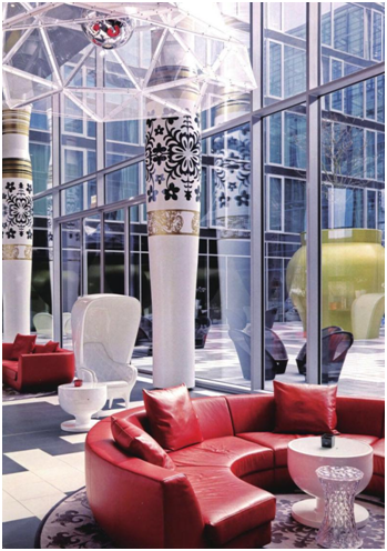 大堂設(shè)計應(yīng)遵循酒店“以人為本”的經(jīng)營理念,注重營造寬敞、華麗、輕松的氛圍,為客人帶來美好的享受。酒店形象定位、投資規(guī)模、建筑結(jié)構(gòu)等條件決定大堂的整體風(fēng)格和效果。在大堂設(shè)計中,應(yīng)采用各種設(shè)計方法圍繞概念主題營造大堂氛圍。